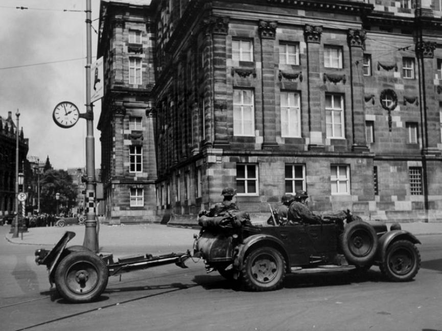 На фотографии: артиллеристы полка СС «Дер Фюрер» на легковом автомобиле Вандерер W-11 проезжают мимо Королевского дворца в Амстердаме. Нидерланды, 1940 год.