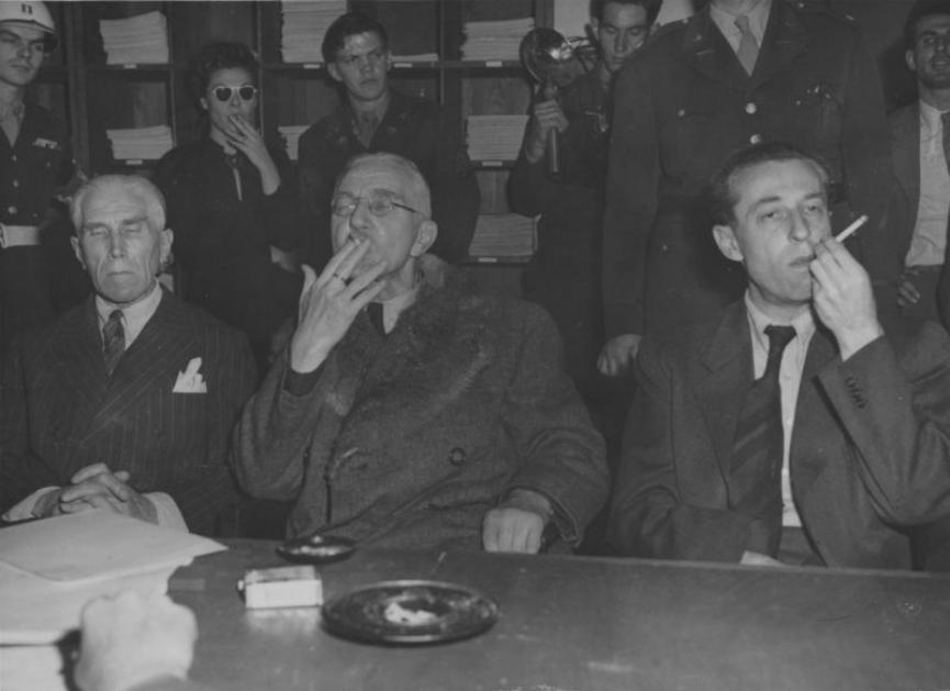 На фотографии: Ф. фон Папен, Я. Шахт и Г. Фриче на перекуре во время Нюрнбергского процесса. Нюрнберг, 1946 год.