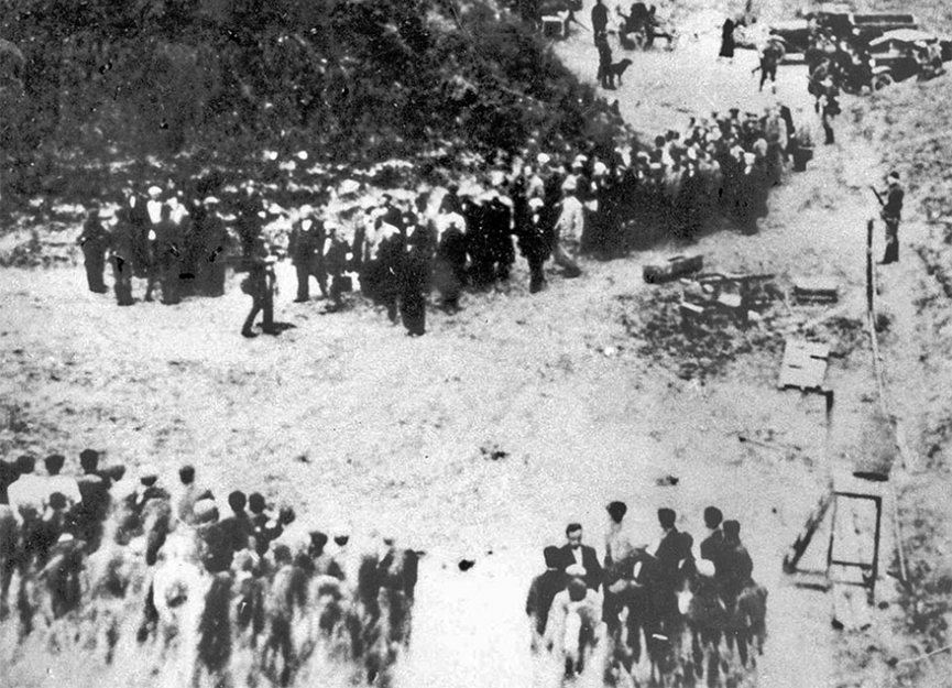 Начиная с 1943 года гитлеровские преступники пытаются принимать всяческие меры для сокрытия следов своих преступлений, в частности сжигать трупы. Документально установлено, что гитлеровцы заставляли свои жертвы сначала заготовлять дрова и брёвна, затем ложиться на эти брёвна. После этого первый слой людей расстреливался. Следующая партия, предназначенная к расстрелу, вновь приносила брёвна, клала их на первый ряд мертвецов и должна была ложиться на эти брёвна для расстрела.