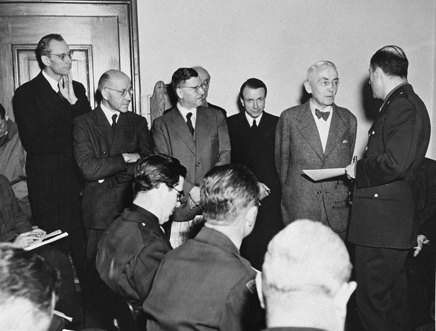 На фотографии: защитник Геринга Отто Штамер в комнате с новостными корреспондентами до начала Нюрнбергского процесса. Нюрнберг, 1945 год.