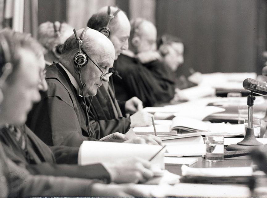 На фотографии: председатель Международного военного трибунала во Дворце юстиции, Джеффри Лоуренс.Нюрнберг, 1946.