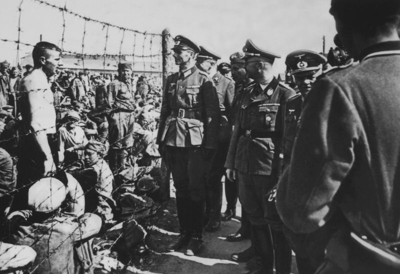 На фотографии: рейхсфюрер СС Генрих Гиммлер с руководителем СС и полиции Эрихом фон дем Бахом в лагере военнопленных во время инспекционной поездки по Белоруссии. Белоруссия, 1941 год.